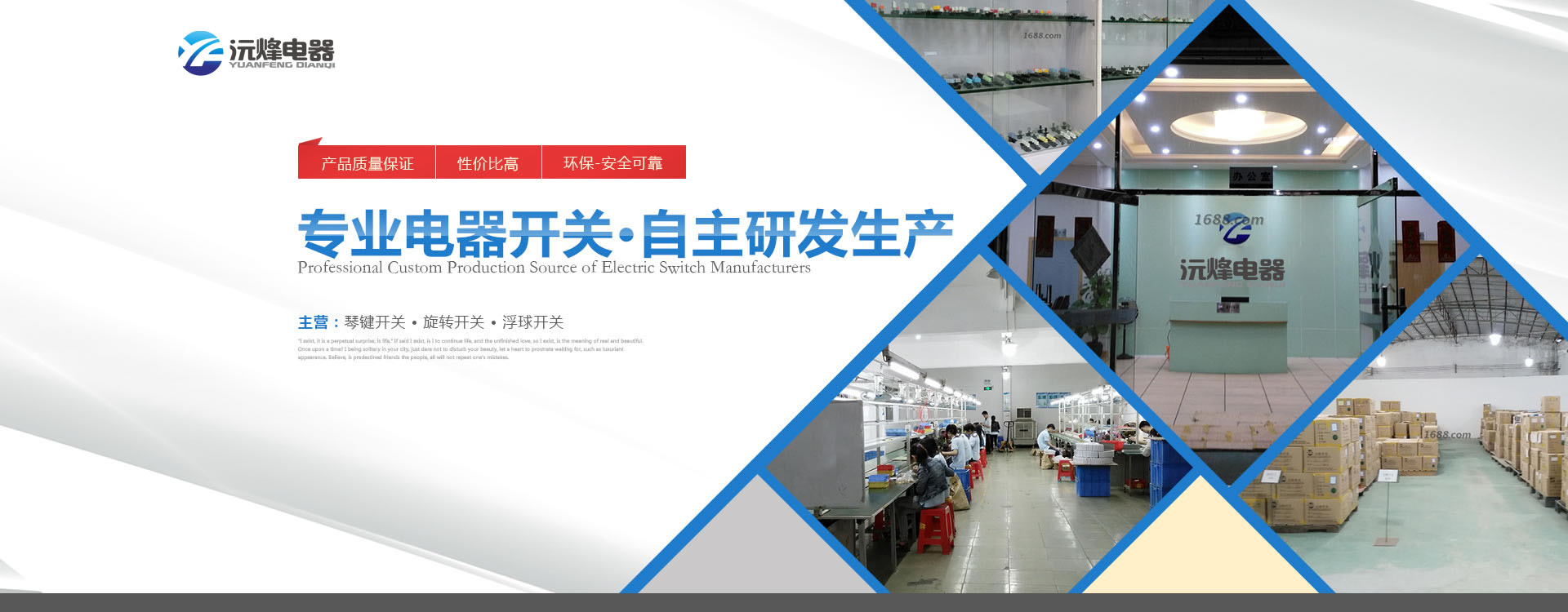 佛山市順德區(qū)沅烽電器有限公司是一家自主研發(fā)及生產(chǎn)各種電器開(kāi)關(guān)以及接線端子座企業(yè),產(chǎn)品主要有浮球開(kāi)關(guān)、琴鍵開(kāi)關(guān)、旋轉(zhuǎn)開(kāi)關(guān)、微動(dòng)開(kāi)關(guān)、按鍵開(kāi)關(guān)等系列,產(chǎn)品廣泛應(yīng)用在空調(diào)、電風(fēng)扇、電飯煲、電暖器、電烤箱、微波爐、榨汁機(jī)、攪拌機(jī)等家電行業(yè)。 本公司提供產(chǎn)品從設(shè)計(jì)開(kāi)發(fā)到制造檢驗(yàn)及跟蹤服務(wù)的全部流程,自主擁有模具設(shè)計(jì)制造、自動(dòng)沖壓、精密注塑成型及組裝等部門。公司不斷完善檢測(cè)體系并引進(jìn)高精度檢測(cè)儀器,其中有被美國(guó)安全試驗(yàn)檢驗(yàn)公司即UL公司認(rèn)可的安規(guī)實(shí)驗(yàn)室。 本公司于2003年通過(guò)并實(shí)施ISO9001國(guó)際品質(zhì)管理認(rèn)證體系,產(chǎn)品相繼獲得CQC、CE、TUV、UL認(rèn)證,同業(yè)內(nèi)眾多知名企業(yè)如美的、TCL、海信科龍、格蘭仕等保持長(zhǎng)期的合作關(guān)系,有部分產(chǎn)品出口多個(gè)國(guó)家。 我們堅(jiān)持走專業(yè)化的道路,以一流的產(chǎn)品及服務(wù)答謝客戶,愿與各界朋友共創(chuàng)美好明天...        查看更多